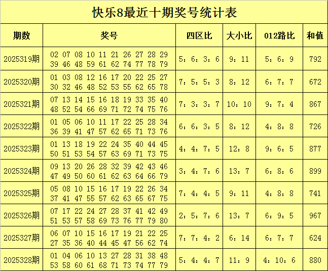 福彩应允8第2025328期开奖转头:01 04 06 10 13 27 28 31 38 48 53 58 60 61 68 71 73 74 77 79,其中奖号四区比为5:4:4:7。